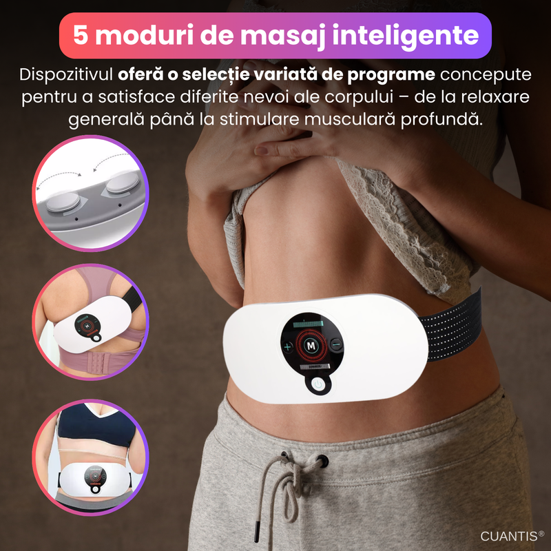 Centura este echipata cu 5 programe distincte de masaj care combina impulsuri electrice EMS si vibratii ritmice. Aceste moduri simuleaza diverse tehnici de masaj profesional si sunt proiectate sa relaxeze muschii, sa stimuleze circulatia si sa contribuie la tonifierea zonelor vizate. Fiecare mod este adaptat pentru a oferi efecte specifice: calmare, energizare, stimulare, detensionare si activare musculara.