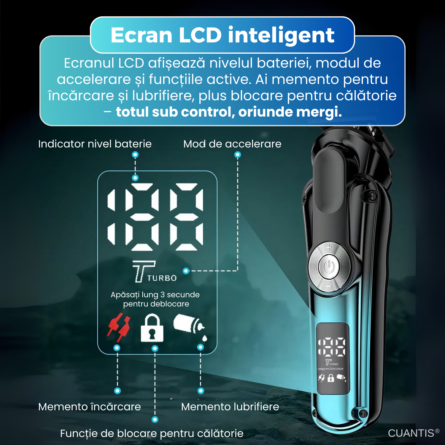 Ecranul digital afiseaza nivelul bateriei, modul de utilizare si alte informatii esentiale, astfel incat ai control total asupra performantei aparatului.