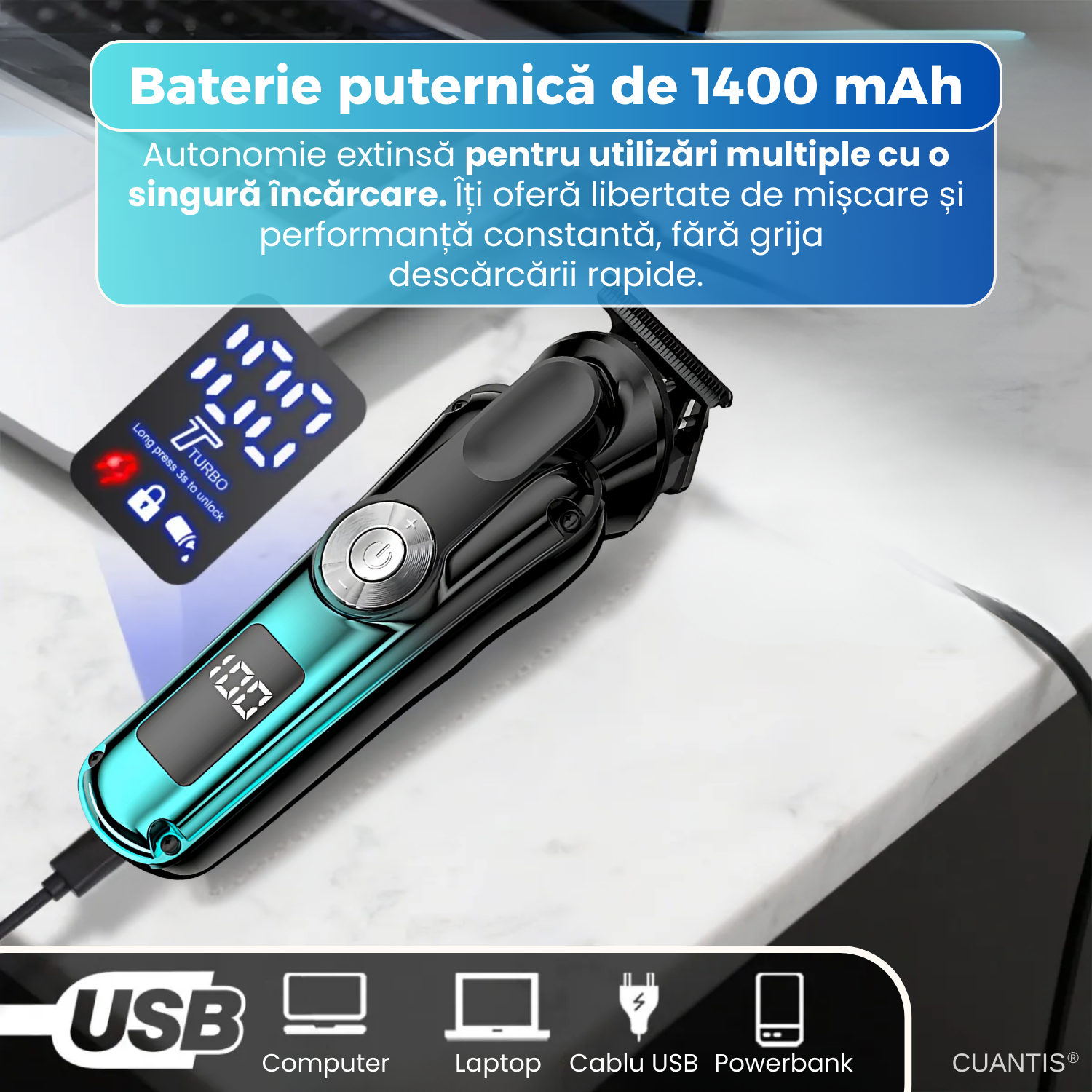 Baterie: 1400 mAh, autonomie pana la 90 minute