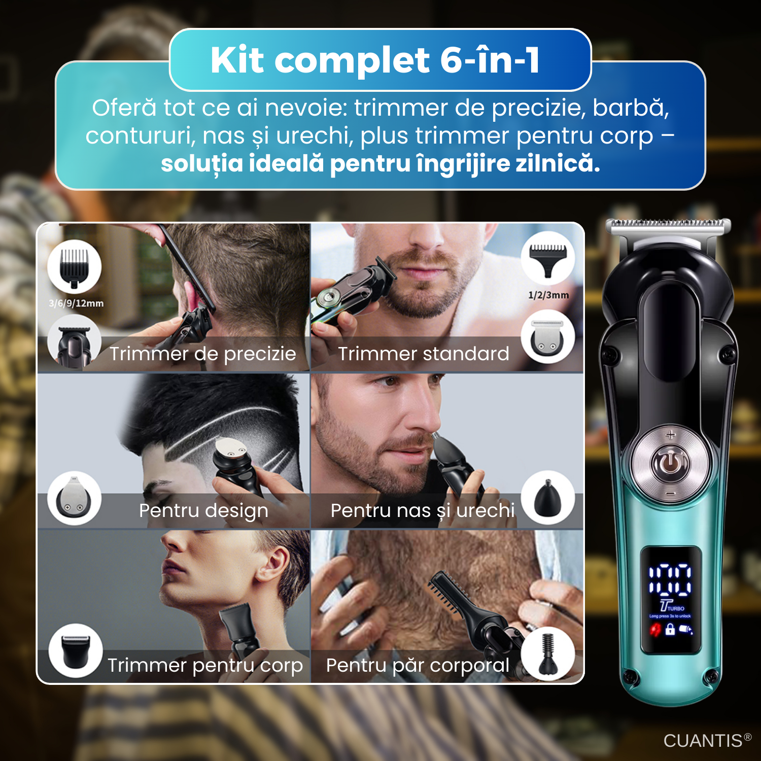Aparatul de tuns fara fir 6 in 1 este solutia perfecta pentru o ingrijire personala completa. Puternic, precis si versatil, ofera performante profesionale in confortul propriei case. Cu lame din titan, motor silentios, doua trepte de viteza si rezistenta la apa, acest kit este creat pentru a raspunde tuturor nevoilor tale. Este practic, economic si sigur, fiind alegerea ideala atat pentru uz personal, cat si pentru un cadou inspirat.