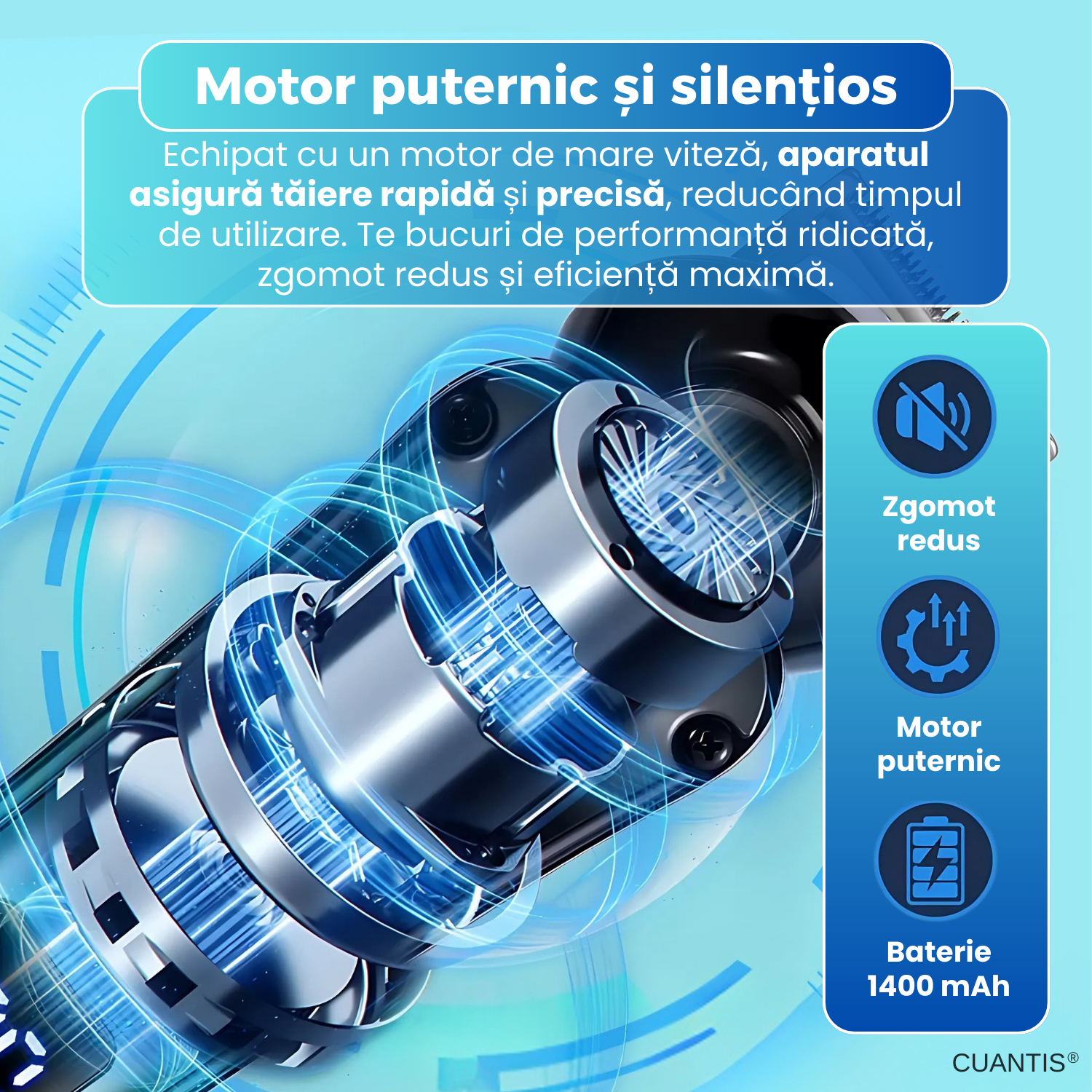 Echipat cu un motor de mare viteza, aparatul taie rapid si eficient, reducand timpul de utilizare. Zgomotul redus il face potrivit chiar si pentru copii sau pentru utilizari frecvente in casa.