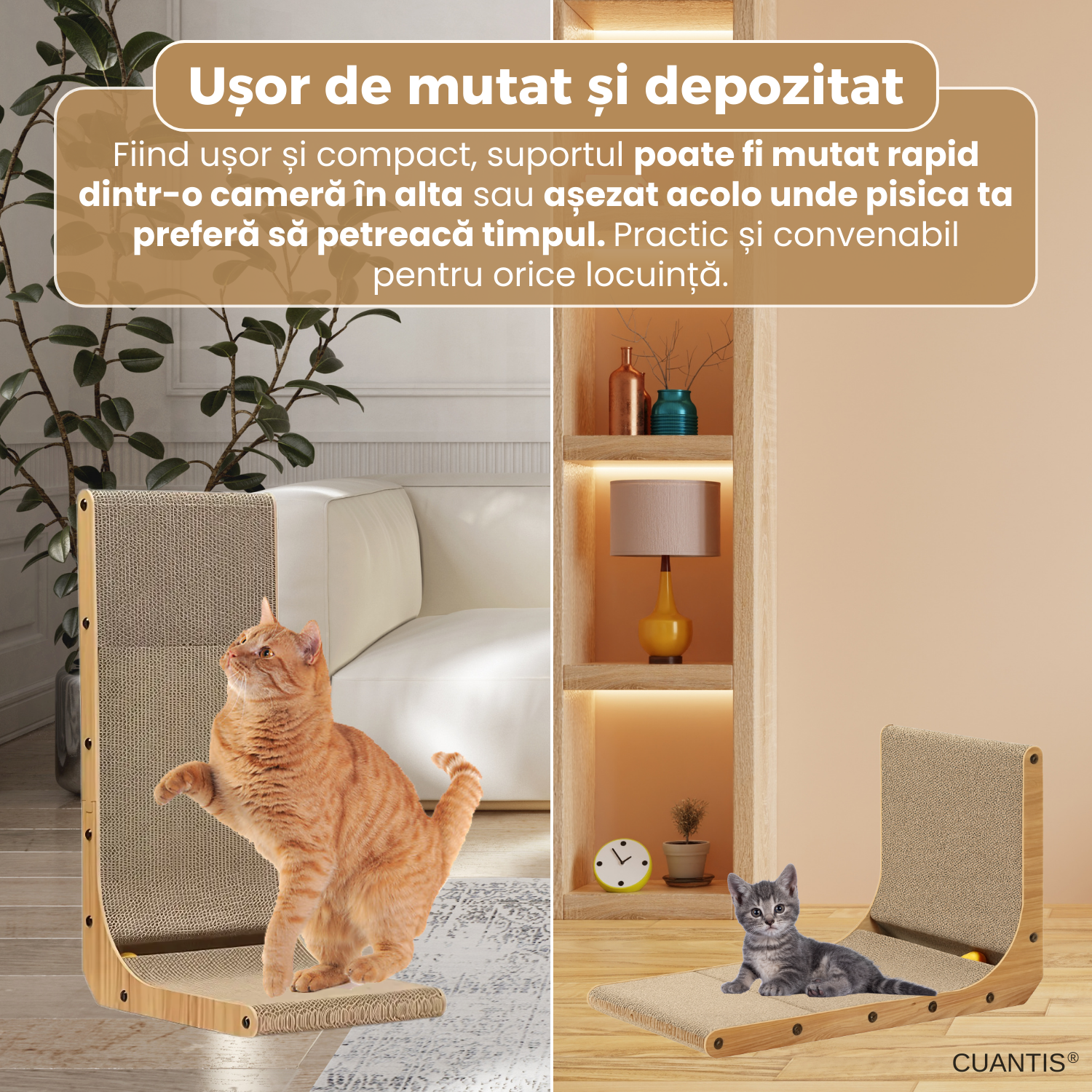 Fiind usor si compact, produsul poate fi mutat cu usurinta dintr-o camera in alta. Forma sa il face simplu de asezat langa canapea, in coltul preferat al pisicii sau oriunde doresti, fara sa ocupe mult spatiu si fara sa deranjeze aspectul incaperii.