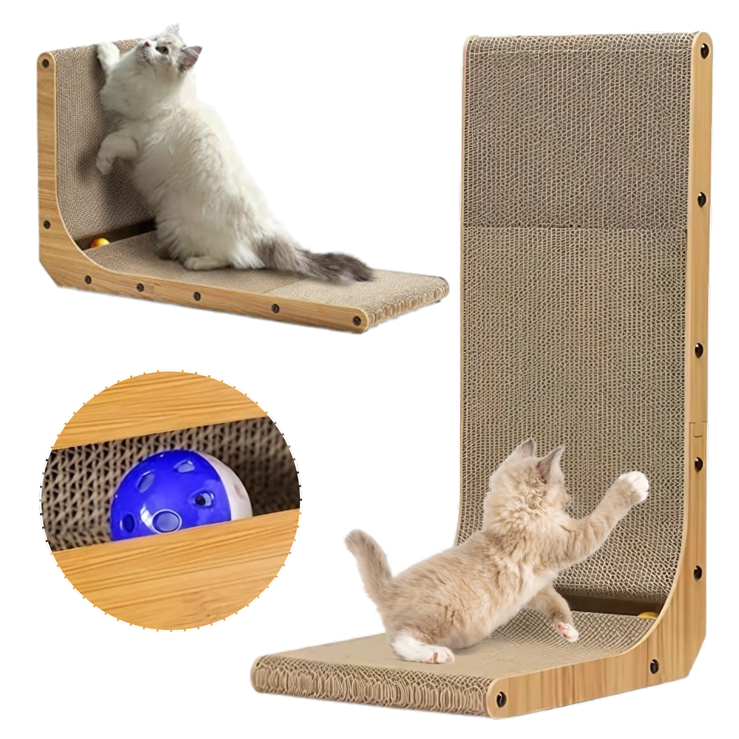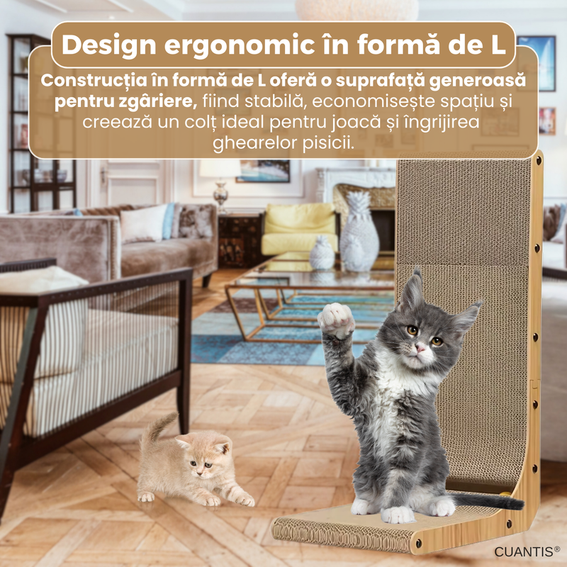 Pisicile au nevoie sa zgarie pentru a-si mentine ghearele sanatoase si pentru a-si consuma energia. Din pacate, acest obicei natural ajunge de multe ori sa deterioreze canapelele, covoarele sau alte piese de mobilier. Suportul de zgariere in forma de L este solutia perfecta: ofera o suprafata generoasa, durabila si atractiva pentru pisica ta, protejand in acelasi timp locuinta. Fabricat din carton ondulat rezistent si lemn, produsul este eco-friendly, sigur pentru animale si usor de integrat in orice casa.