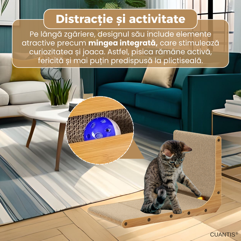 Pe langa suprafata de zgariere, produsul este prevazut cu o jucarie tip bila care sporeste atractivitatea si stimuleaza curiozitatea pisicii. Aceasta combinatie transforma placa intr-o sursa constanta de joaca, reducand stresul si prevenind plictiseala.