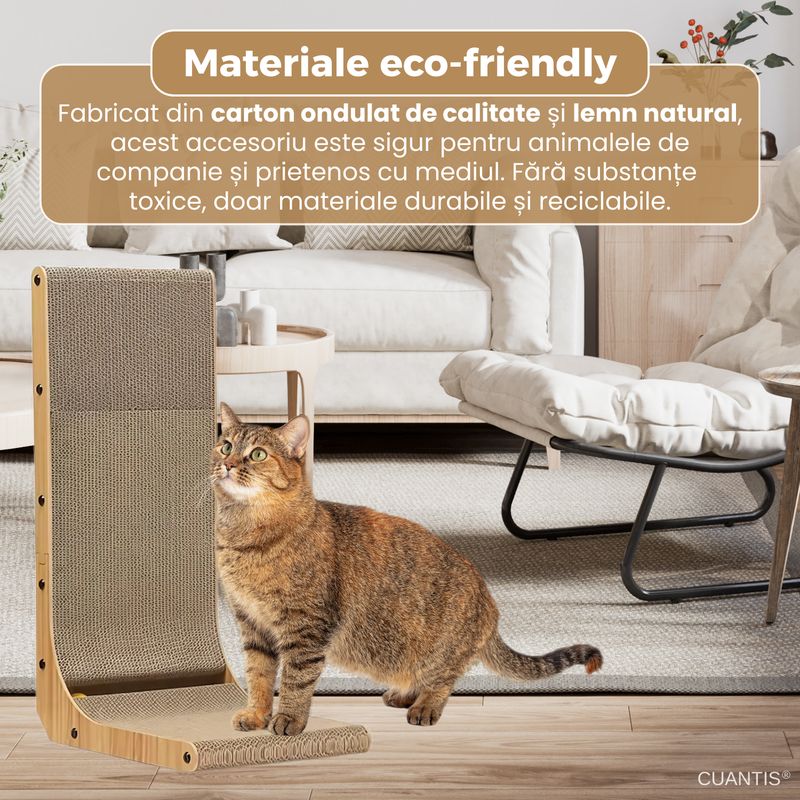Produsul este fabricat din carton ondulat rezistent si lemn, doua materiale naturale, reciclabile si prietenoase cu mediul. Acestea nu contin substante toxice sau componente daunatoare, fiind complet sigure pentru pisica ta. In plus, textura cartonului atrage instinctiv animalele si le ofera satisfactia de care au nevoie la fiecare sesiune de zgariere.