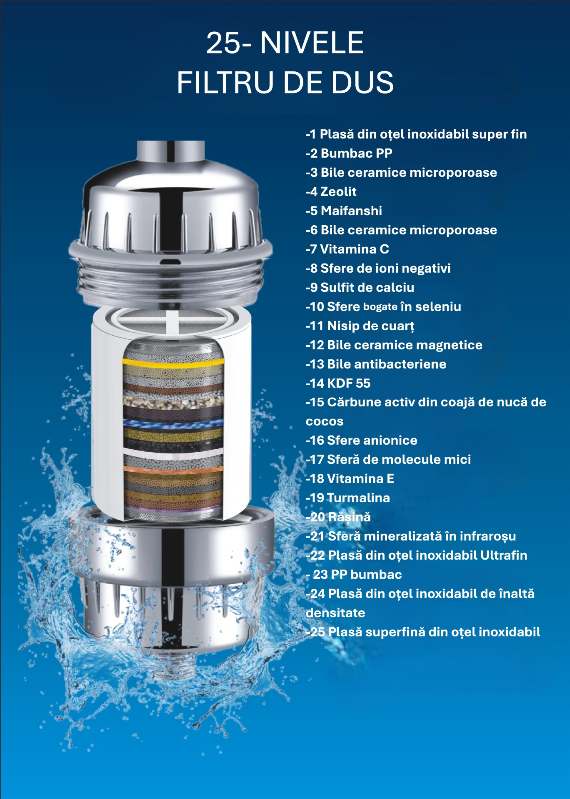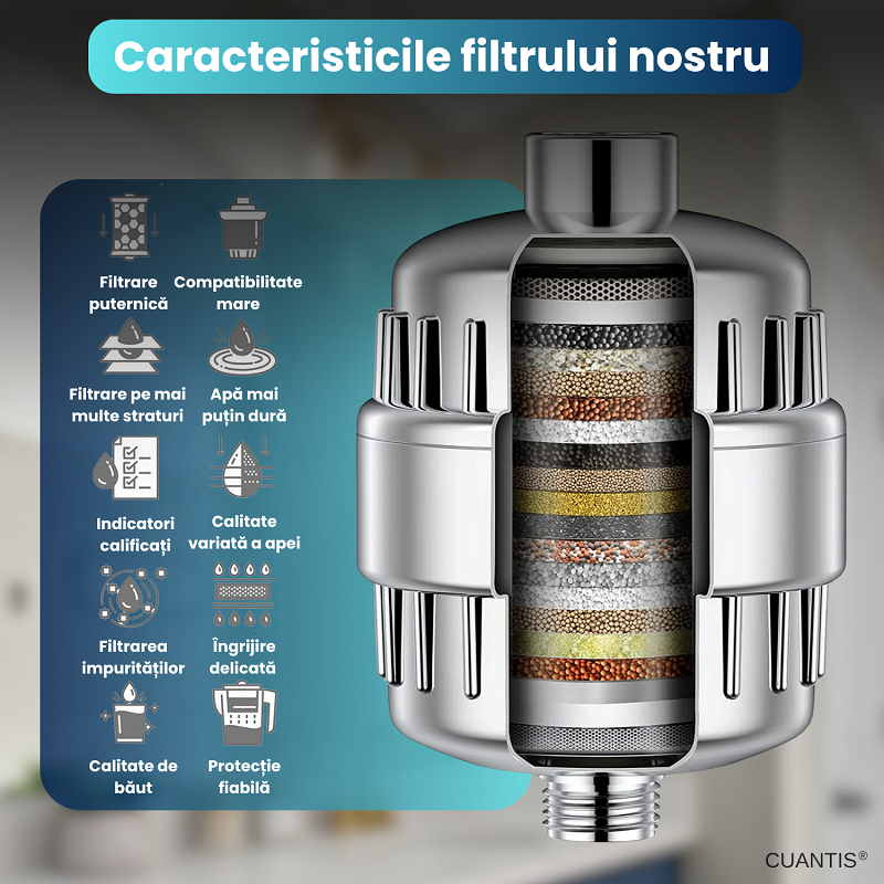 Sistem de filtrare avansat in 25 de etape: Include straturi multiple precum KDF-55, carbon activ, bile minerale, sulf de calciu si filtre ceramice pentru a elimina eficient clorul, fluorul, metalele grele (plumb, mercur), rugina, sedimentele, bacteriile si mirosurile neplacute.