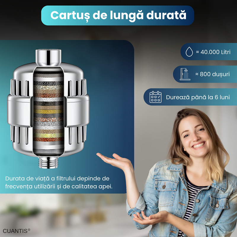 In conditii normale de utilizare, cartusul poate functiona eficient pana la 6 luni, eliminand nevoia schimbarilor frecvente si reducand astfel costurile pe termen lung. Desigur, durata reala de viata a filtrului depinde de mai multi factori, precum frecventa dusurilor, numarul de utilizatori si, cel mai important, calitatea apei din zona ta (nivelul de impuritati, duritatea apei, continutul de clor etc.).