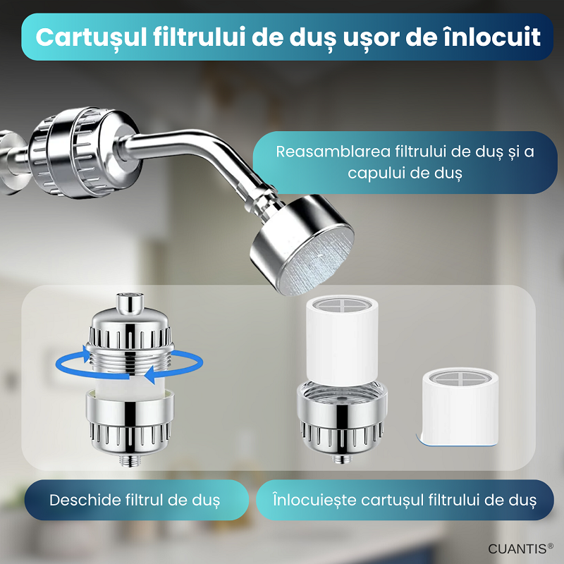 Inlocuirea cartusului filtrului de dus se face simplu, in doar cateva minute, fara unelte sau interventii complicate.