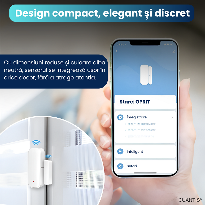 Instalare fara scule sau gauri: Senzorul se monteaza rapid si usor cu banda adeziva inclusa. Nu necesita cabluri, suruburi sau unelte, fiind ideal pentru apartamente, usi interioare, geamuri sau mobilier.